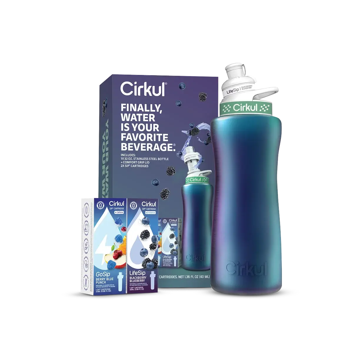 The 32oz. Chameleon Stainless Steel Bottle and Lid mirror the magical wonder of the color-shifting chameleon. This Cirkul Starter Kit includes an insulated bottle that keeps your water ice-cold all day and a flavor cartridge system that makes drinking water more delicious, fun, and personalized.